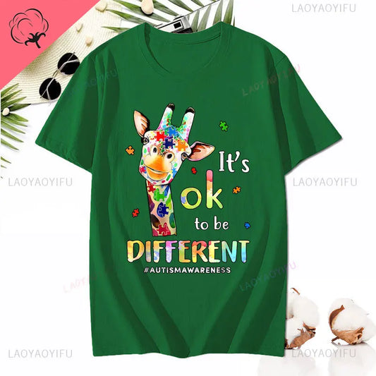 Cute Giraffe Animal Its Ok To Be Different T-Shirt Autism Awareness T Shirt Kawaii Clothes Man Women Clothing Cotton Short-sleev