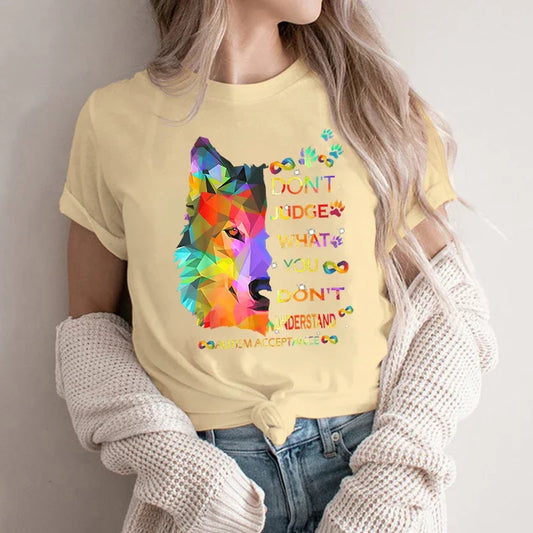 Autism Awareness T-shirts New Lovely Female Tops Wolf Don‘t Judge Print Tees Fashion Cartoon O-neck Ladies Wolf Graphic Clothes