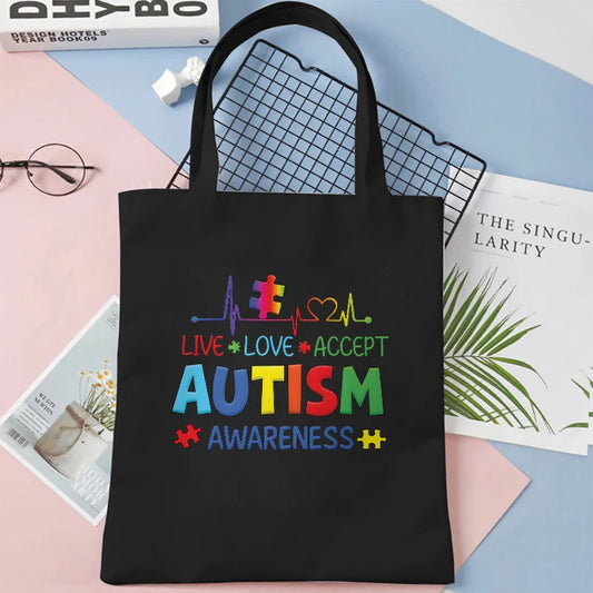 Woman Canvas Tote Bags Live Love Accept Autism Awareness Large Capacity Handbag Fashion Daily Reusable Shoulder Shopping Bag
